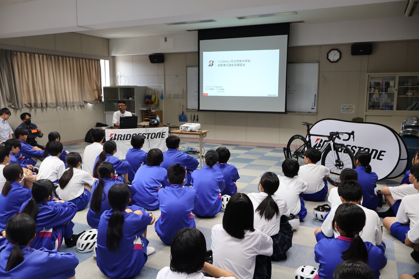 活動内容:中学校より依頼を受け、当社従業員が講師となり、「自転車安全利用五則」を基本とした自転車の交通ルールや、学校周辺の道路を例にした危険予知トレーニング、ヘルメットの正しい被り方などについて講習を行いました。