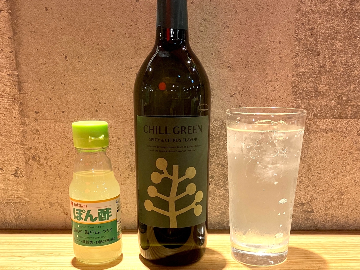 濵田酒造のボタニカル系麦焼酎「CHILL GREEN spicy&citrus」のソーダ割りに、「ぽん酢」をお好みの量加えていただきます。「マーガオ」のレモングラスのような香りと「ぽん酢」のかんきつ果汁&酢の爽やかなお酒です。