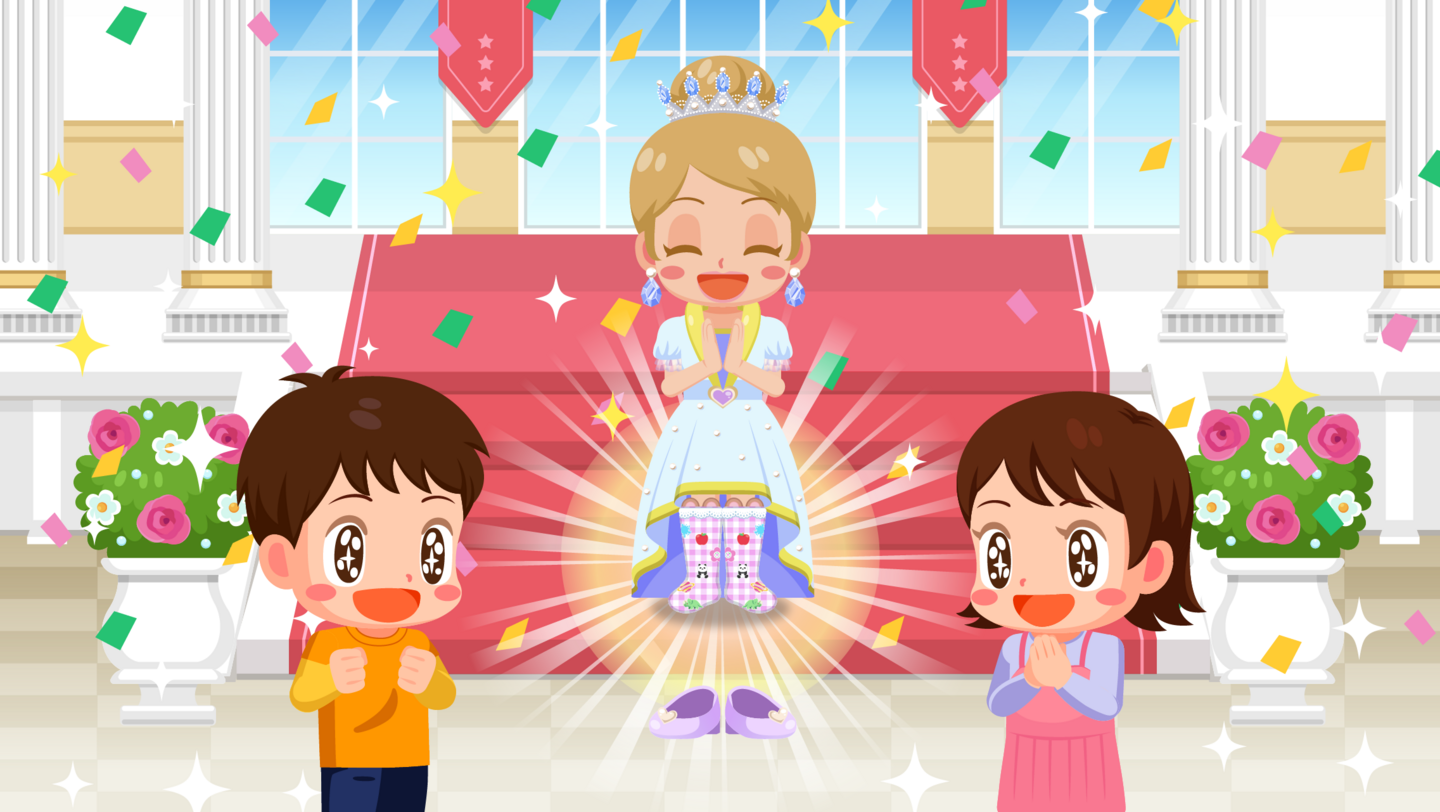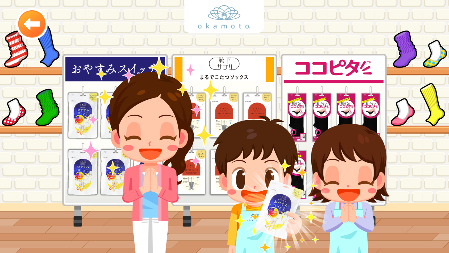 靴下ショップの店員さんになってお客さまの悩みに合わせた靴下を見つけるゲームです。お客様が欲しい靴下と同じ絵柄の靴下を見つけてタップし、たくさんのお客様を笑顔にする体験をお楽しみいただけます。