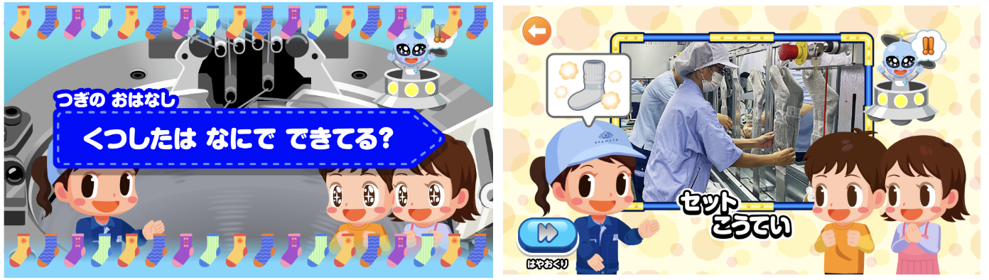 全4話で構成されており、岡本の大ヒット商品「まるでこたつソックス」の製造過程を宇宙人のキャラクターと一緒に学びます。途中、編み機をタップして中を除いてみたり、実際の工場の写真が登場したりと、保護者の方にも一緒に楽しみながら学んでいただける内容となっています。