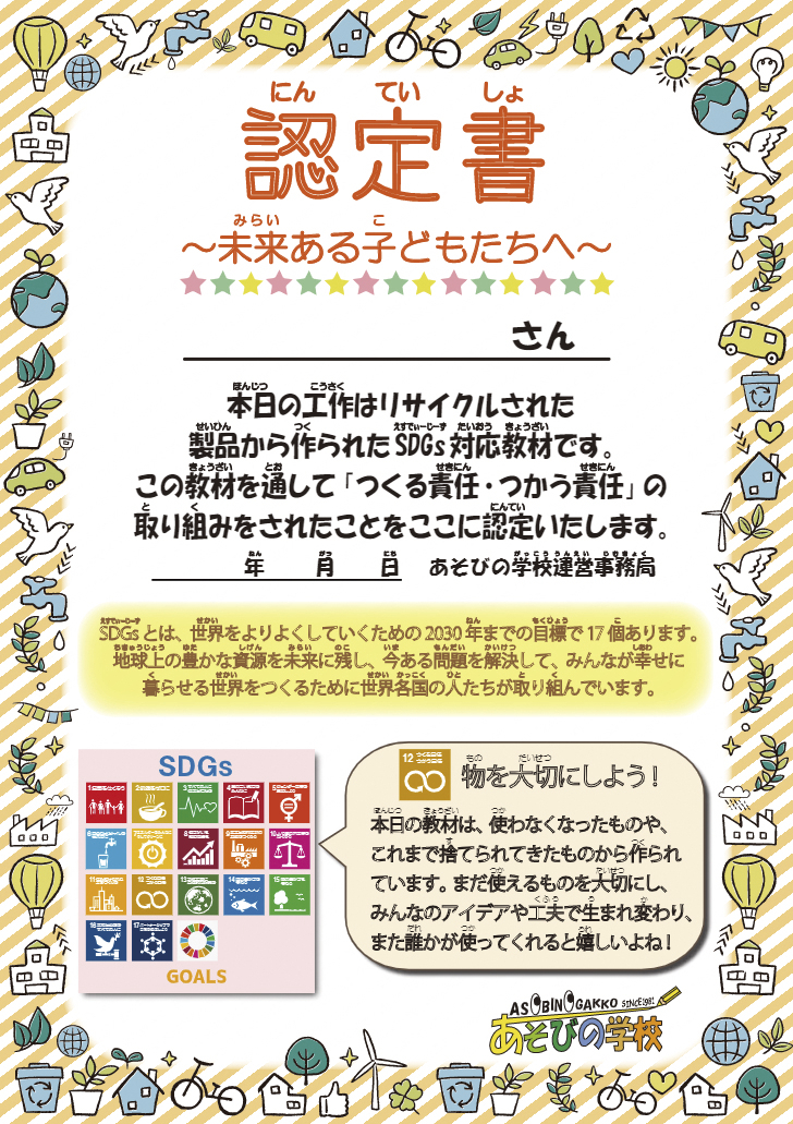 パーツは資源を再利用して作られており完成後にSDGs認定書もプレゼント!