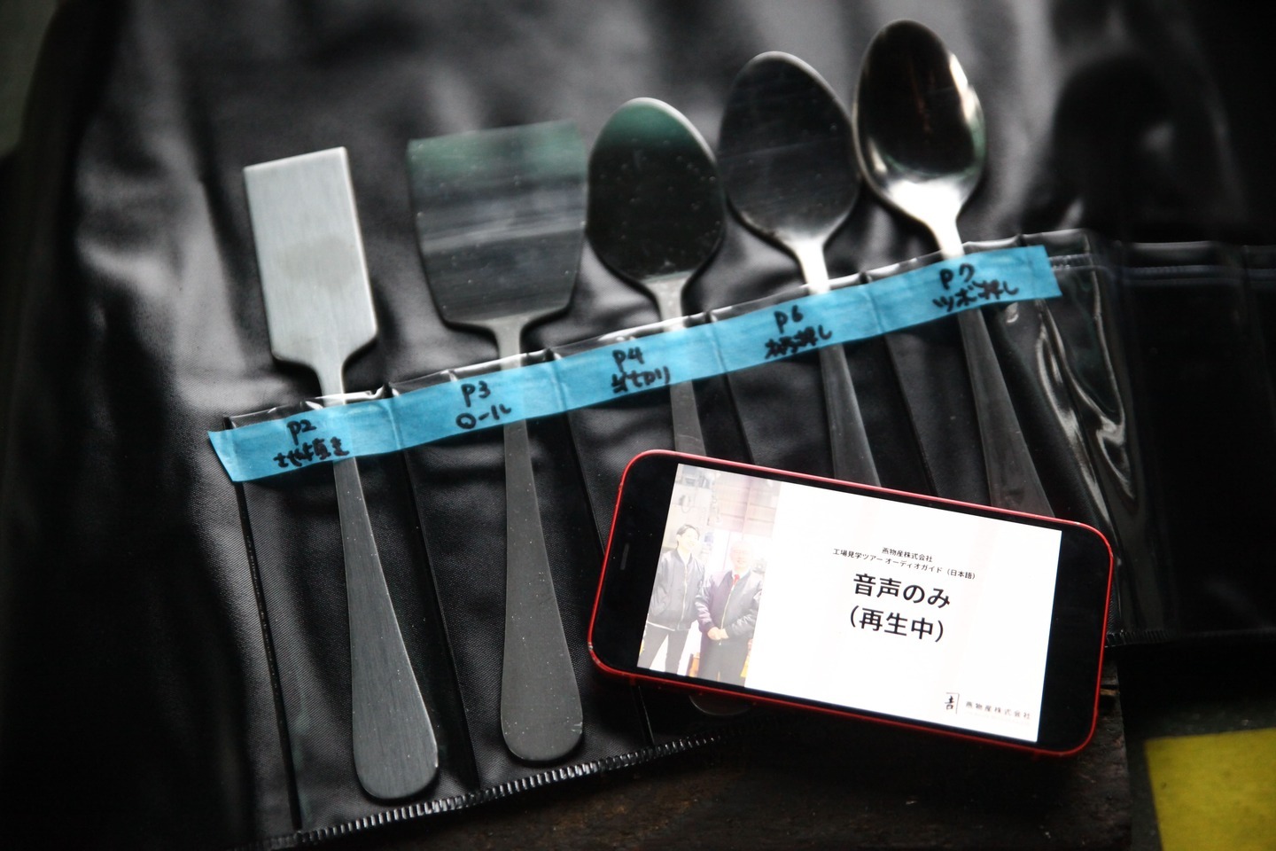 燕三条エリアの工場では分業制が一般的ですが、燕物産では材料から出荷まで一貫生産が可能。工場全体を通して製造工程の現場に触れることができます。多言語対応のオーディオガイド型プログラムを活用。「見る」+「聴く」+「触る」等を掛け合わせ、より強い没入感と臨場感を体験できます。