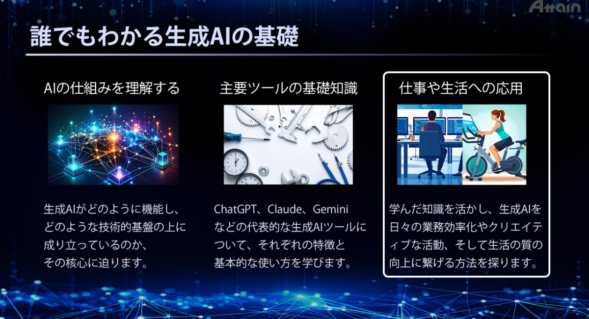 コンピュータートレーニング教材制作、eラーニング向けコンテンツ制作のアテイン株式会社(本社:東京都江東区、電話:03-6381-8641、代表:福嶌崇臣、資本金:1億1470万円)は、法人向けのeラーニングコンテンツ年間レンタルサービスに新たなラインナップとして、生成AIの基礎知識を習得するための教材、動画で学べる「生成AIの基礎」講座を、10月14日に提供開始します。