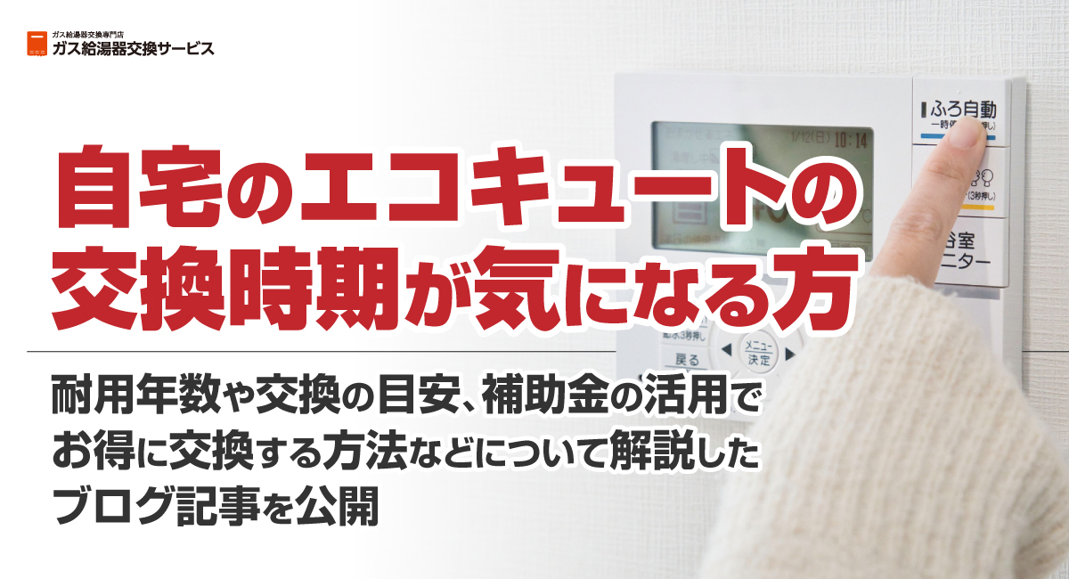 ガス給湯器の交換などを専門に手がけているガス給湯器交換サービス(所在地:東京都練馬区ほか、運営責任者:安田 欣爾)は、ご家庭などでエコキュートを利用しているユーザー向けに最新のブログ記事「『うちのエコキュートいつまで使える?』寿命を延ばす使い方と補助金を活用した交換費用相場」を2025年9月29日(月)に公式ウェブサイトで公開しました。耐用年数が近い、過ぎていると起きる不具合のほか、メーカー別の交換費用相場、活用できる補助金など、エコキュート利用者が知っておきたい情報についてくわしく解説しています。