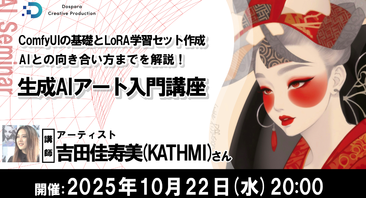 ドスパラは、アーティストの吉田佳寿美(KATHMI)氏を迎え、「生成AIアート入門講座」を、2025年10月22日(水) 20時よりオンラインで開催します。現在、参加者を募集しています。