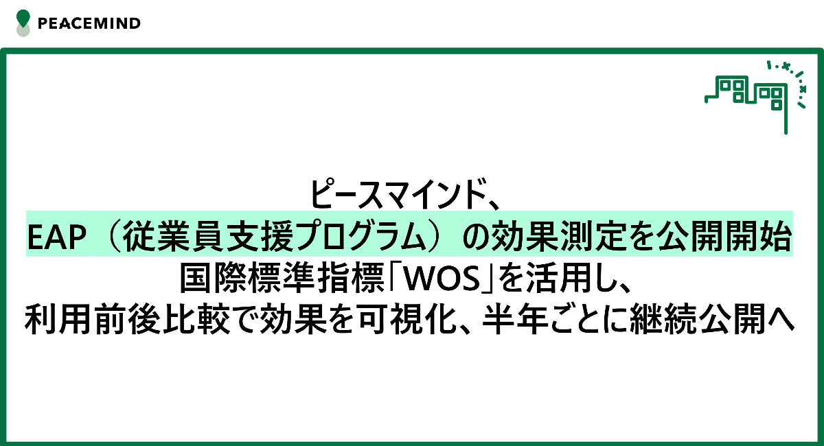 企業向けに『はたらくをよくする®』支援事業を展開するピースマインド株式会社(本社:東京都中央区、代表取締役社長:荻原英人、以下「ピースマインド」)は、当社が提供するEAP(従業員支援プログラム、以下EAP)の効果測定の結果を、2025年10月より継続的に公開します。