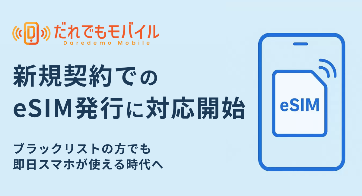 だれでもモバイル株式会社(本社:東京都台東区、代表取締役:湖尻純)は、2025年10月14日より、eSIMでの新規契約・開通に対応したことをお知らせいたします。これにより、従来のSIMカード郵送を待たずに、審査不要・即日でスマホを利用できる環境が整いました。携帯ブラックリストの方や、生活保護・非正規雇用・外国人の方など、通信契約でお困りの方に、よりスムーズな通信環境を提供いたします。eSIM対応の背景