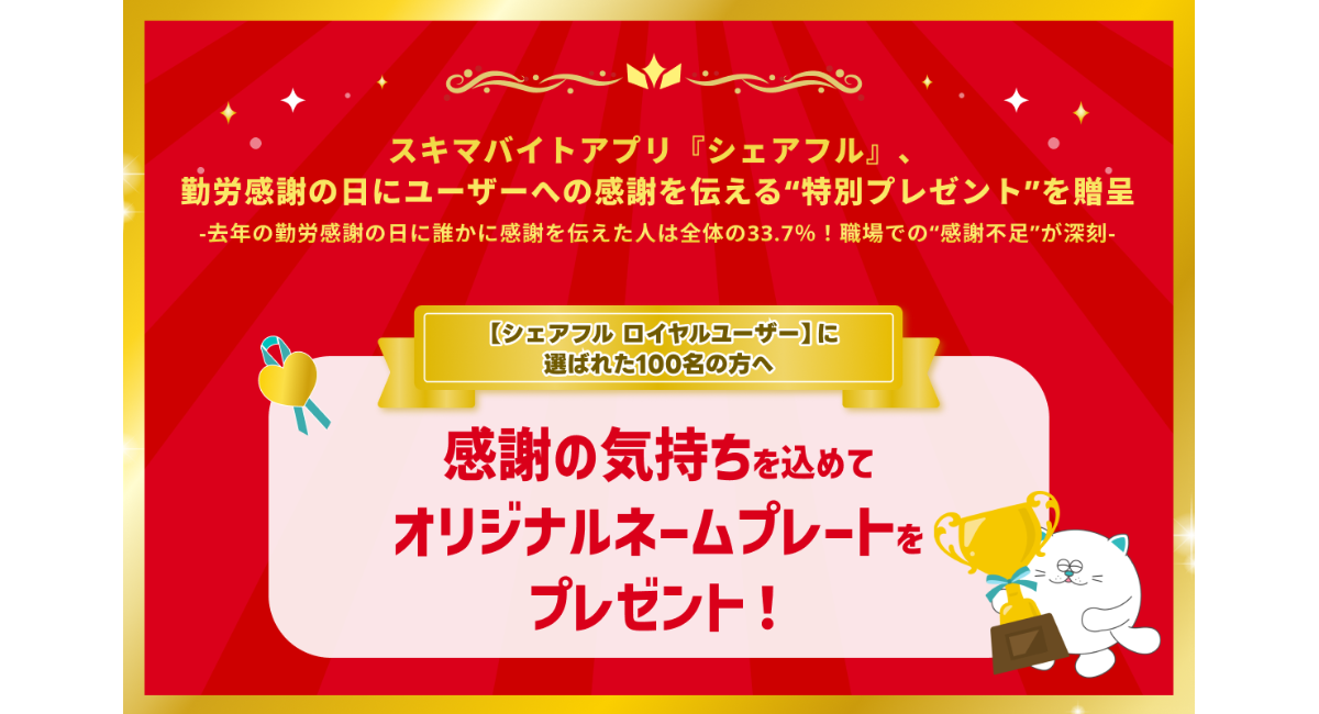 「はたらいて、笑おう。」をビジョンに掲げるパーソルグループのスキマバイトアプリ『シェアフル』やSaaSシフト管理サービス『シェアフルシフト』、就業実績を活用した人材紹介サービス『シェアフルエージェント』などを提供するシェアフル株式会社(本社:東京都港区、代表取締役社長:横井 聡)は、2025年11月23日(日)の「勤労感謝の日」に合わせ、シェアフルを通じて日々はたらくユーザーの皆さまへ感謝を伝える取り組みとして、「シェアフルロイヤルユーザー」として選出した100名に、オリジナルネームプレートを贈呈いたします。